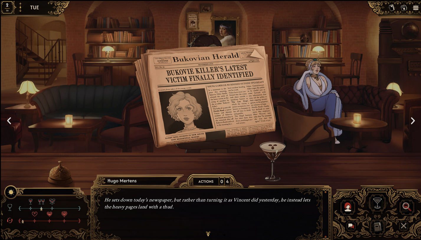 At the end of each workday, the bartender goes home to their apartment where they can take the time to review and combine the clues they collected that day from speaking with their patrons.