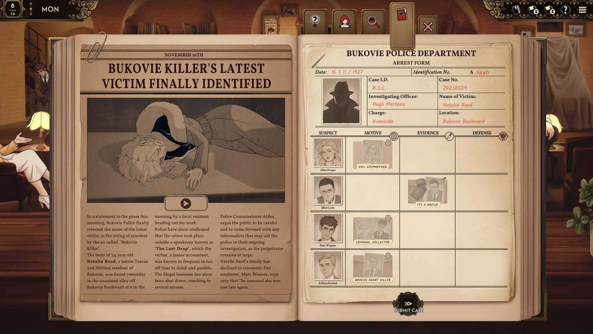 While not directly responsible for writing, ensuring the narrative made sense from a gameplay perspective was something I frequently assisted with. This mainly began with planning all the clues for each case at the planning stage.